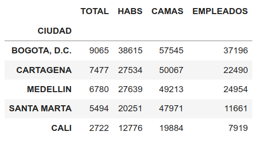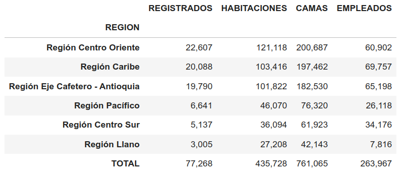 Esta infraestrutura turística se encuentra concentrada en tres regiones: Región Centro Oriente, Región Caribe y Región Eje Cafetero Antioquia, con el 80% del total de registrados, el 74% de los empleos y el 74% de habitaciones hoteleras del país. Las 5 principales ciudades por número de registros son: Bogotá D.C. (9065), Cartagena (7477), Medellín (6780), Santa Marta (5494) y Cali (2722).