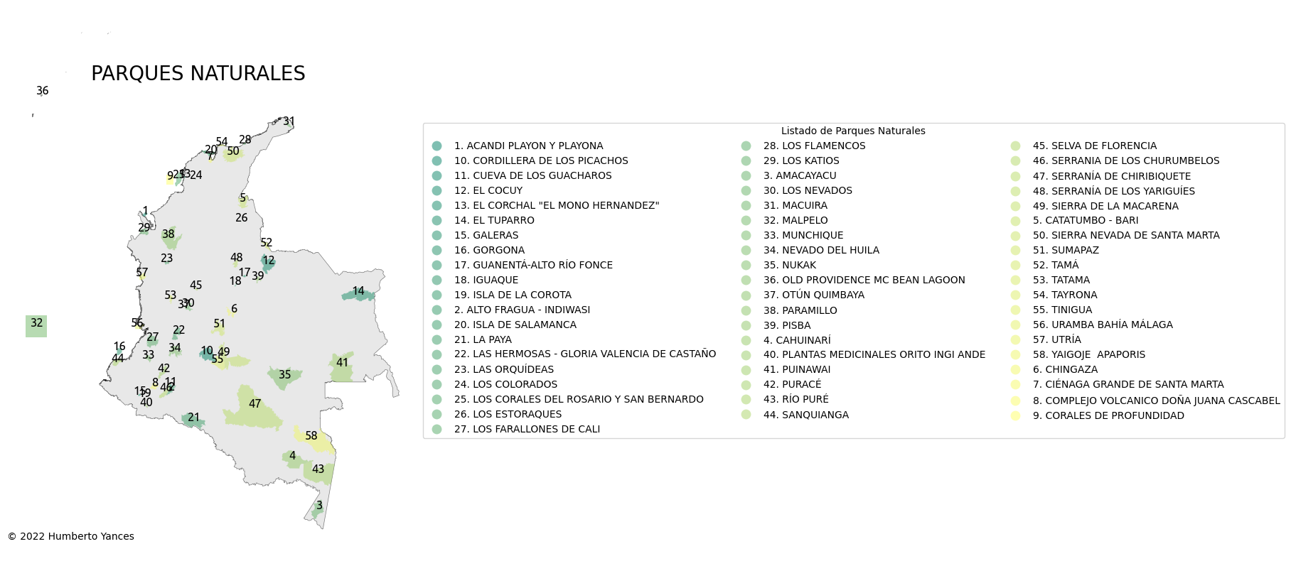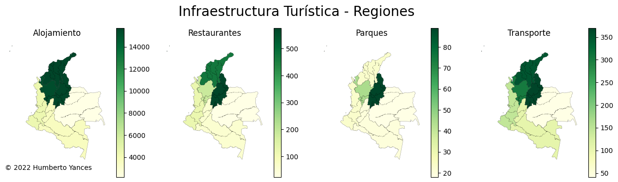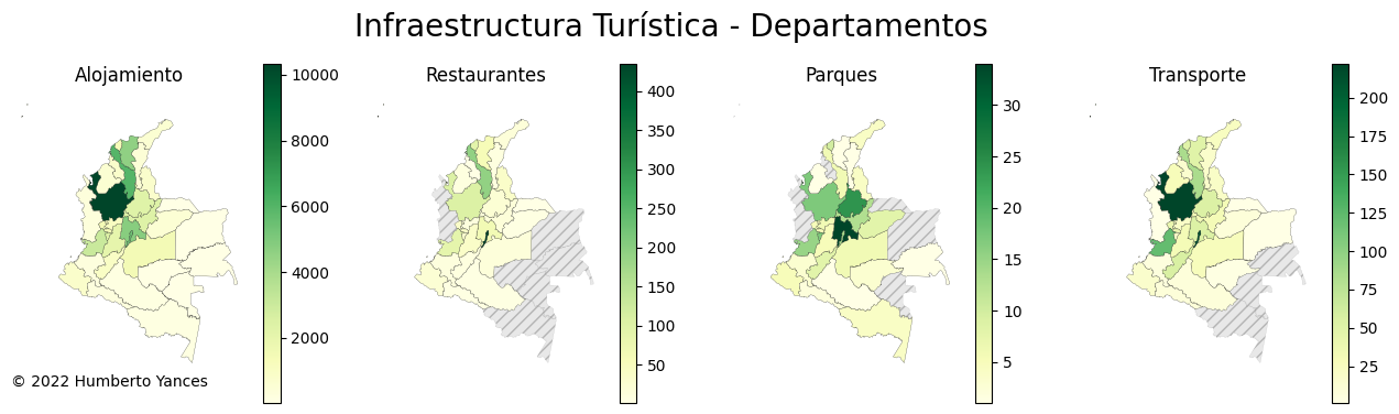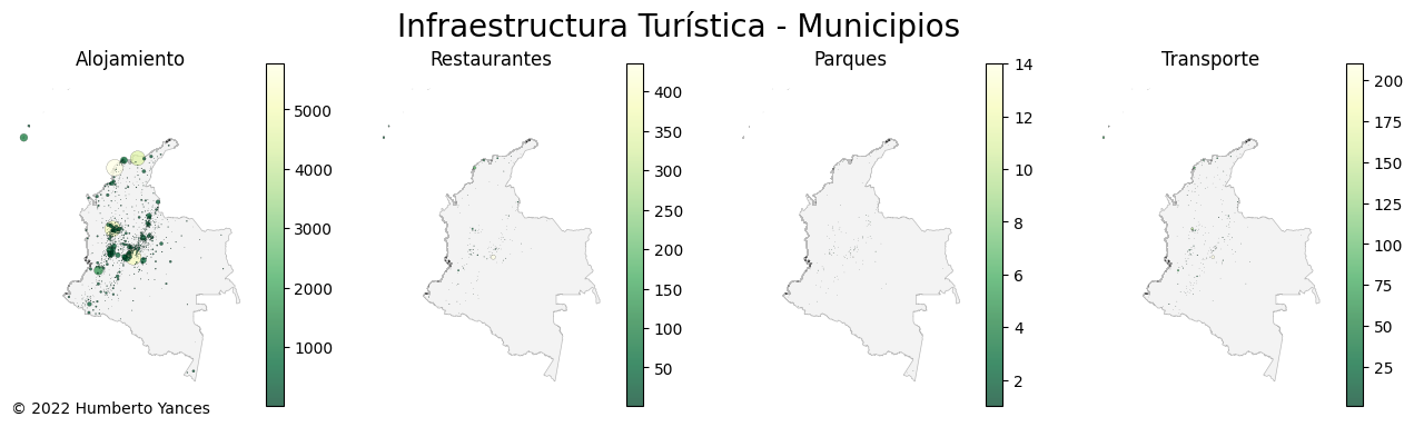 def inf_turism_mapplotter(categories, geo_level) ''' Create a one row-four columns chart of maps by RNT categories grouped by regions, departaments or towns. Args: categories: a four element list of lists of RNT categories. geo_level: municipio, departamento or region ''' df_infr = [] i=0 geo_level_dict = {'cod_dpto':depart_geom, 'cod_mun':municipios, 'cod_reg':regions} suptitle = {'cod_dpto':' - Departamentos', 'cod_mun': ' - Municipios', 'cod_reg':' - Regiones'} title = ['Alojamiento', 'Restaurantes', 'Parques', 'Transporte'] for infr in categories: name = 'df'+str(i) name = rnt[rnt['categoria1'].isin(infr)].groupby([geo_level], as_index=True)\ .agg(total=('ano', 'count'), habitaciones=('habitaciones1','sum'),\ camas=('camas1', 'sum'), empleados=('num_emp1', 'sum')).reset_index() df_infr.append(name) i+=1 if geo_level == 'cod_mun': fig, ax = plt.subplots(ncols=len(df_infr), figsize=(16,4)) fig.suptitle('Infraestructura Turística' + str(suptitle[geo_level]), y=1, ha='center', fontsize=20) j=0 for infr in df_infr: #https://gadm.org/download_country.html gp.read_file('data/gadm41_COL_shp/gadm41_COL_0.shp').plot(ax=ax[j], color='lightgrey', alpha=0.25, edgecolor='k', linewidth=0.5) name = 'df'+str(j) name = gp.GeoDataFrame(infr.merge(geo_level_dict[geo_level], on=geo_level, how='right').\ sort_values(by='total', ascending=False)) #, crs='32619' name = name.set_crs(crs='32619', allow_override=True) name.plot(alpha=.75, column='total', cmap='YlGn_r', ax=ax[j], legend=True, edgecolor='k', linewidth=0.15, markersize=name['total']/50, legend_kwds={'alpha':.75}) ax[j].set_title(str(title[j])) ax[j].set_axis_off() #ax[j].add_artist(ScaleBar(1, location='lower left', scale_loc='right', label_loc='left')) j+=1 ax[0].annotate('© 2022 Humberto Yances', xy=(0,-15), xycoords='axes pixels') plt.show() else: fig, ax = plt.subplots(ncols=len(df_infr), figsize=(16, 4)) fig.suptitle('Infraestructura Turística' + str(suptitle[geo_level]), y=1, ha='center', fontsize=20) j=0 for infr in df_infr: name = 'df'+str(j) name = gp.GeoDataFrame(infr.merge(geo_level_dict[geo_level], on=geo_level, how='right')) name = name.set_crs('32619', allow_override=True) name.plot(column='total', cmap='YlGn', ax=ax[j], legend=True, edgecolor='k', linewidth=0.15, missing_kwds={ "color": "lightgrey", "edgecolor": "grey", "hatch": "///", "label": "Missing values", "alpha":0.5 } ) ax[j].set_title(str(title[j])) ax[j].set_axis_off() #ax[j].add_artist(ScaleBar(1, location='lower left', scale_loc='right', label_loc='left')) j+=1 ax[0].annotate('© 2022 Humberto Yances', xy=(0,-10), xycoords='axes pixels') plt.show():